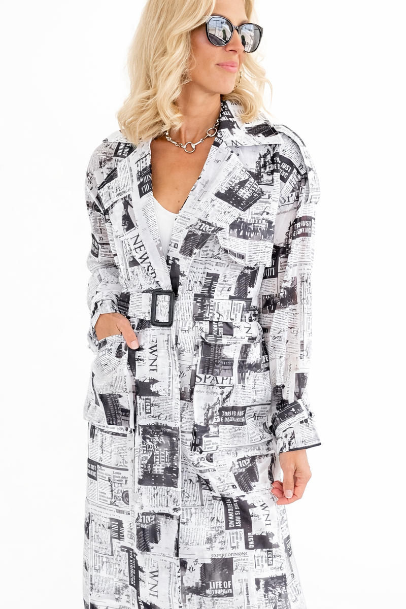 Newspaper Print Belted Trench Dress
